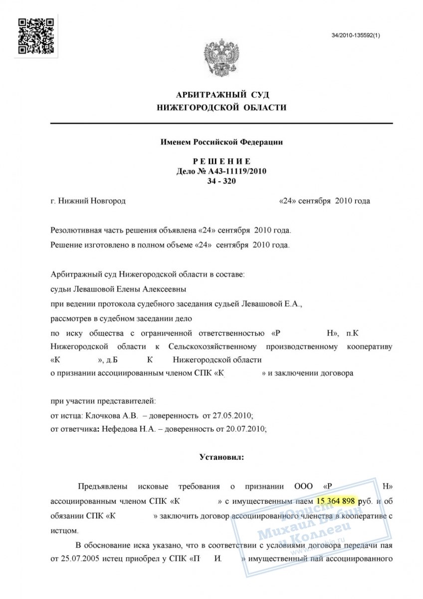 Юрист отстоял право нашего клиента на часть имущества с/х кооператива, несмотря на попытки членов кооператива препятствовать этому.
