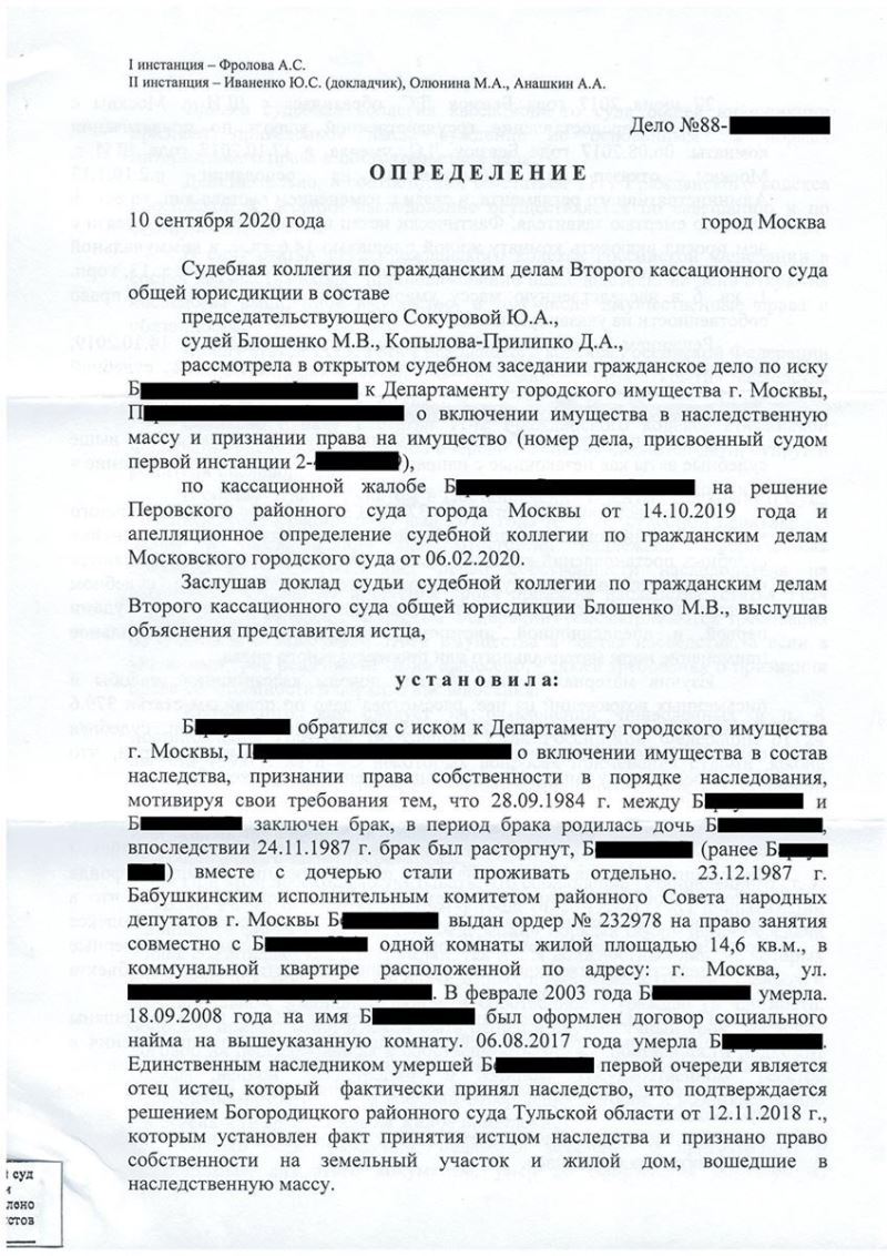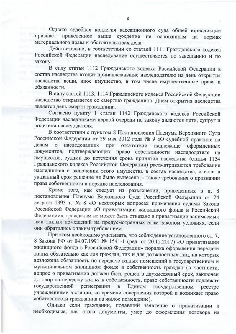 Клиент адвоката – П. обратилась с нестандартной просьбой. В период рассмотрения заявления ее сестры о приватизации жилого помещения она умерла и ее единственным наследником остался отец – Б. Клиент П., при этом, от наследства умершей сестры отказалась. Департамент городского имущества незаконно отказал в приватизации квартиры с нарушением срока, уже после смерти сестры. Суды первой и апелляционной инстанций отказали в удовлетворении иска о включении жилого помещения в наследственную массу умершей и признании за отцом умершей – Б. права собственности.