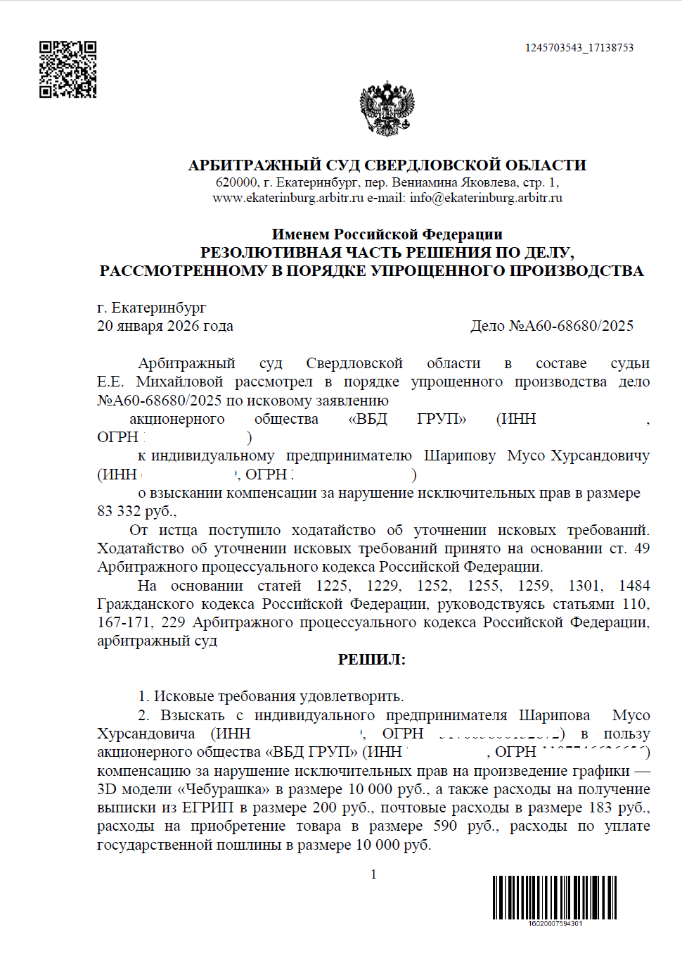 Истец требовал 83 000 руб. за нарушение прав на 3D-модель «Чебурашка». Юристы компании представили контррасчёт, после чего истец добровольно уменьшил иск — итоговая сумма взыскания составила ровно 10 000 руб.