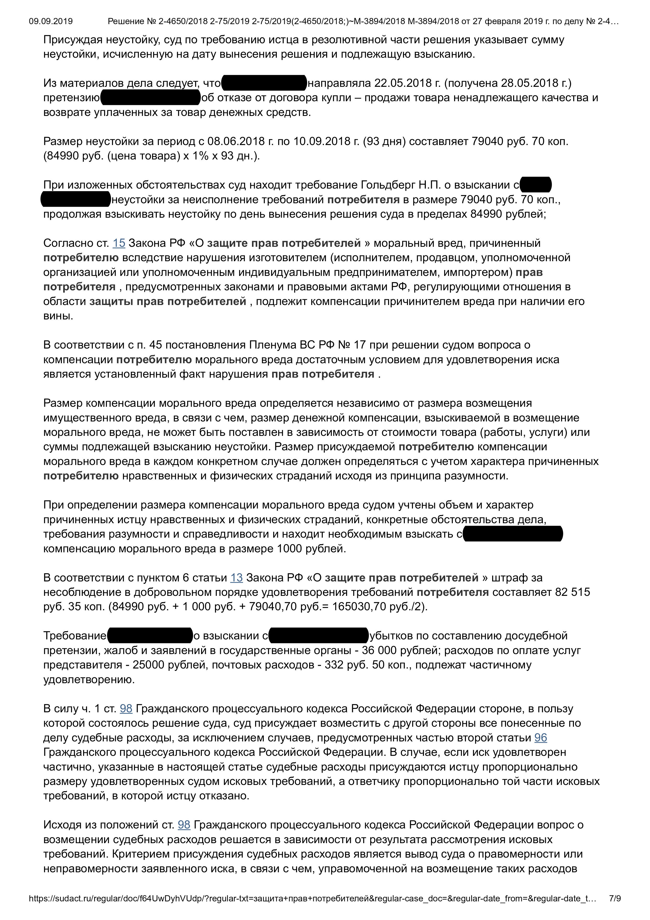 В итоге, в пользу нашей клиентки была взыскана стоимость телевизора, компенсация морального вреда, неустойка, расходы по составлению досудебной претензии, жалоб и заявлений, оплате услуг представителя, почтовые расходы, а также сумма штрафа.