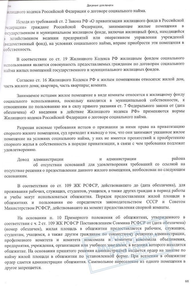 В результате грамотной работы нашего юриста, суд вынес решение о признании за гражданкой К. и ее сыном права собственности на занимаемую комнату по 1/2 доле за каждым.