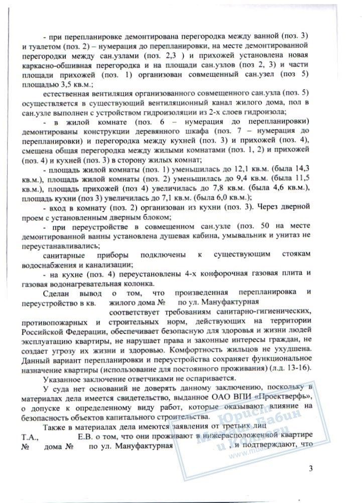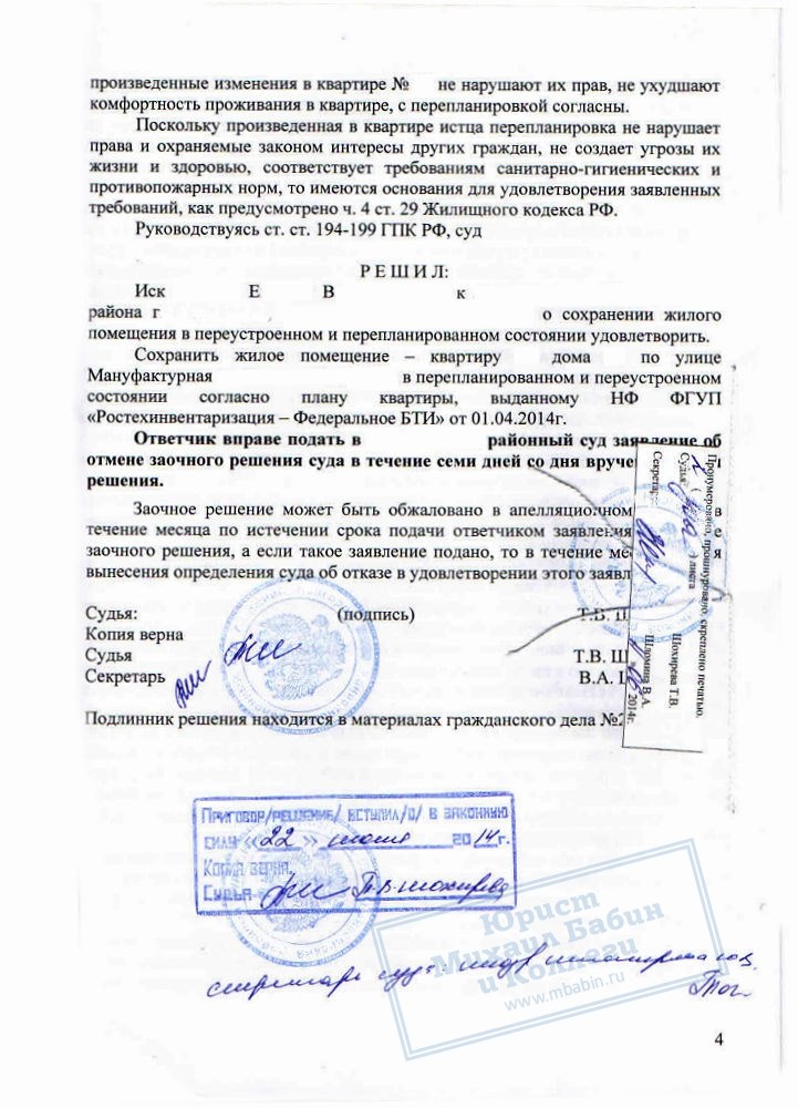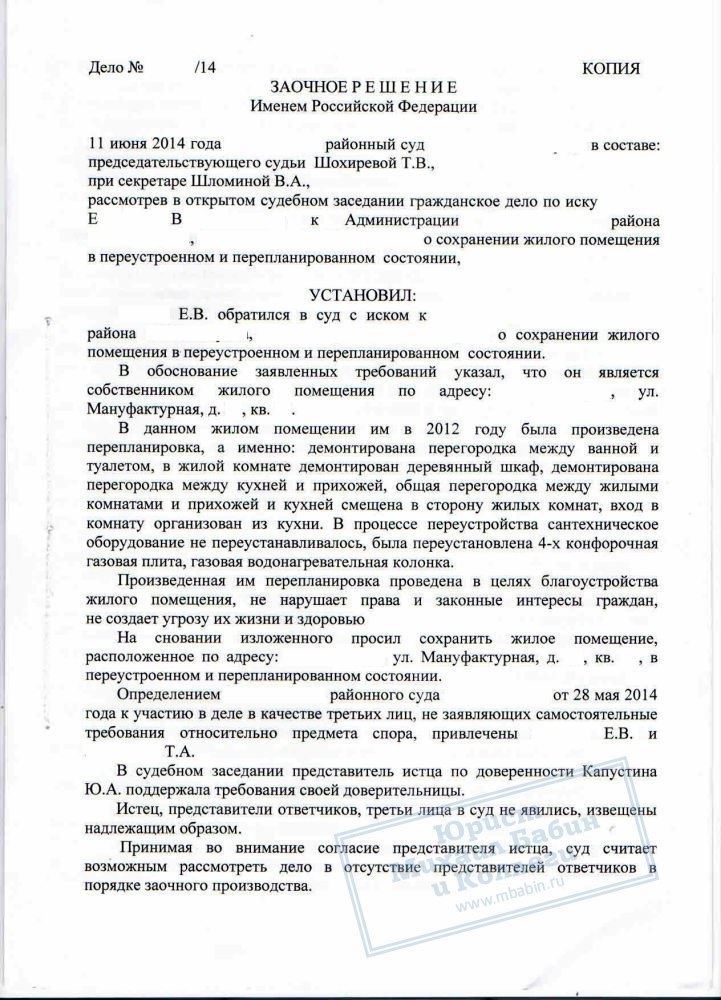 Юристами нашей компании был подготовлен необходимый комплект документов, включая технические, санитарные, противопожарные заключения. По решению суда квартира Е.В. была сохранена в перепланированном состоянии.